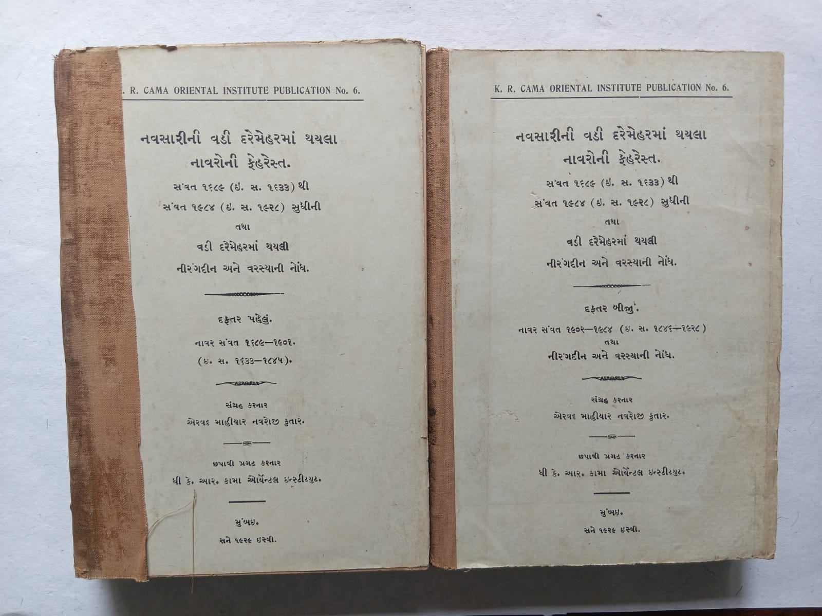 Navsari Navar ane Nirangdinni Feherest Vols. I & II, 1928 – 29 (set) (Guj) by M. N. Kutar